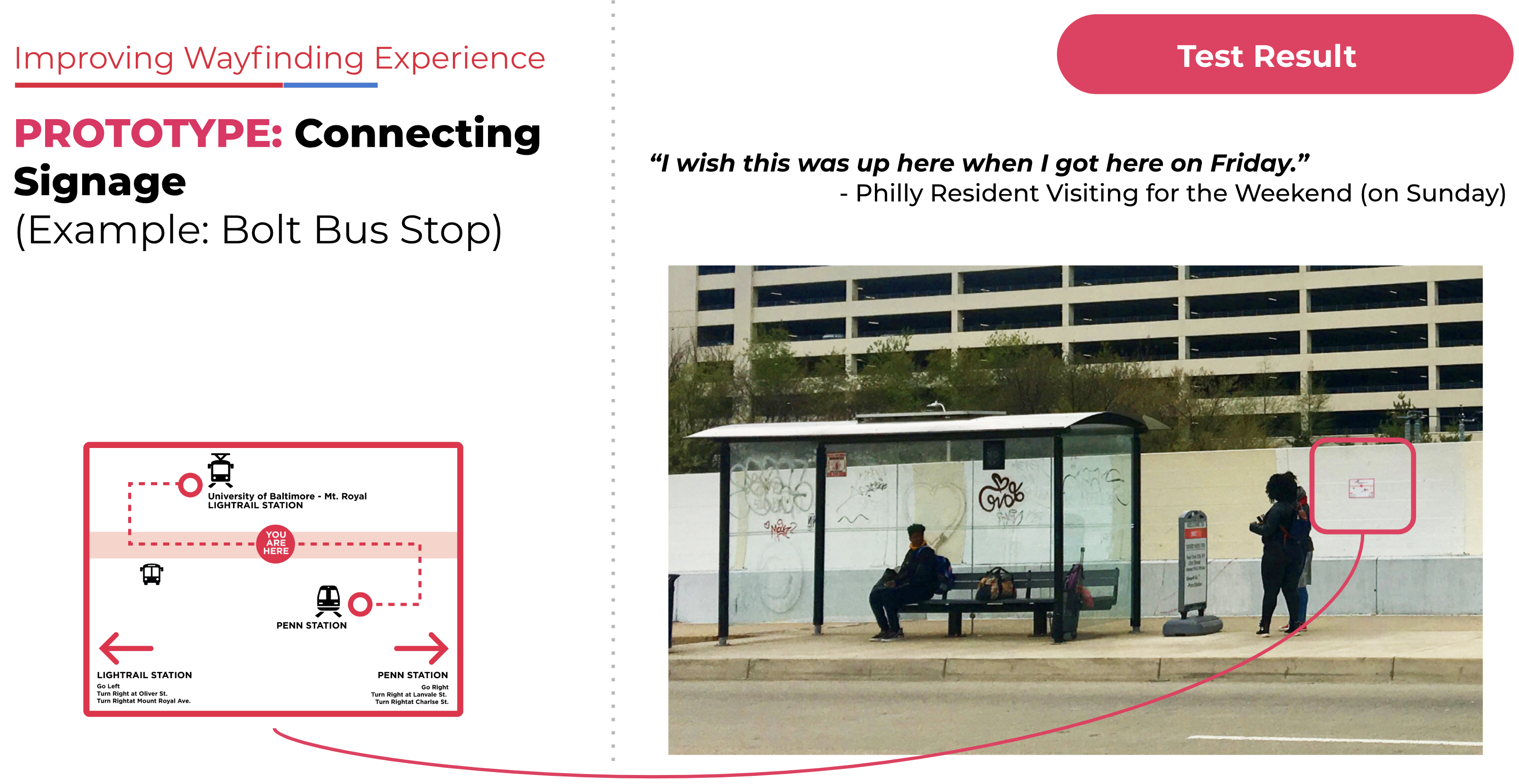 One of our personas was developed from the perspective of a tourist exiting the Bolt bus and attempting to utilize light rail to navigate the city. Placing simple directional signage at the bus stop was well received by passengers.