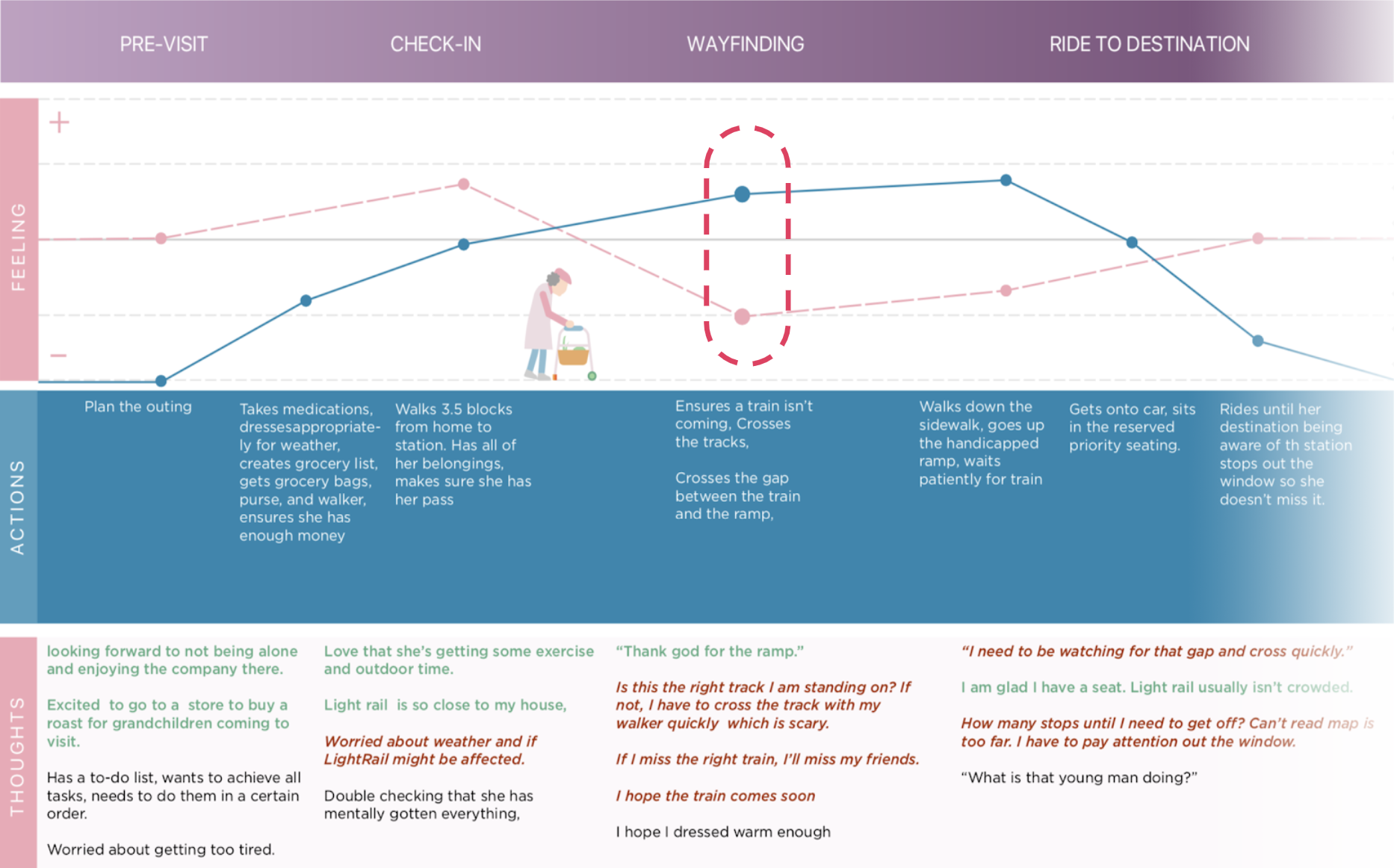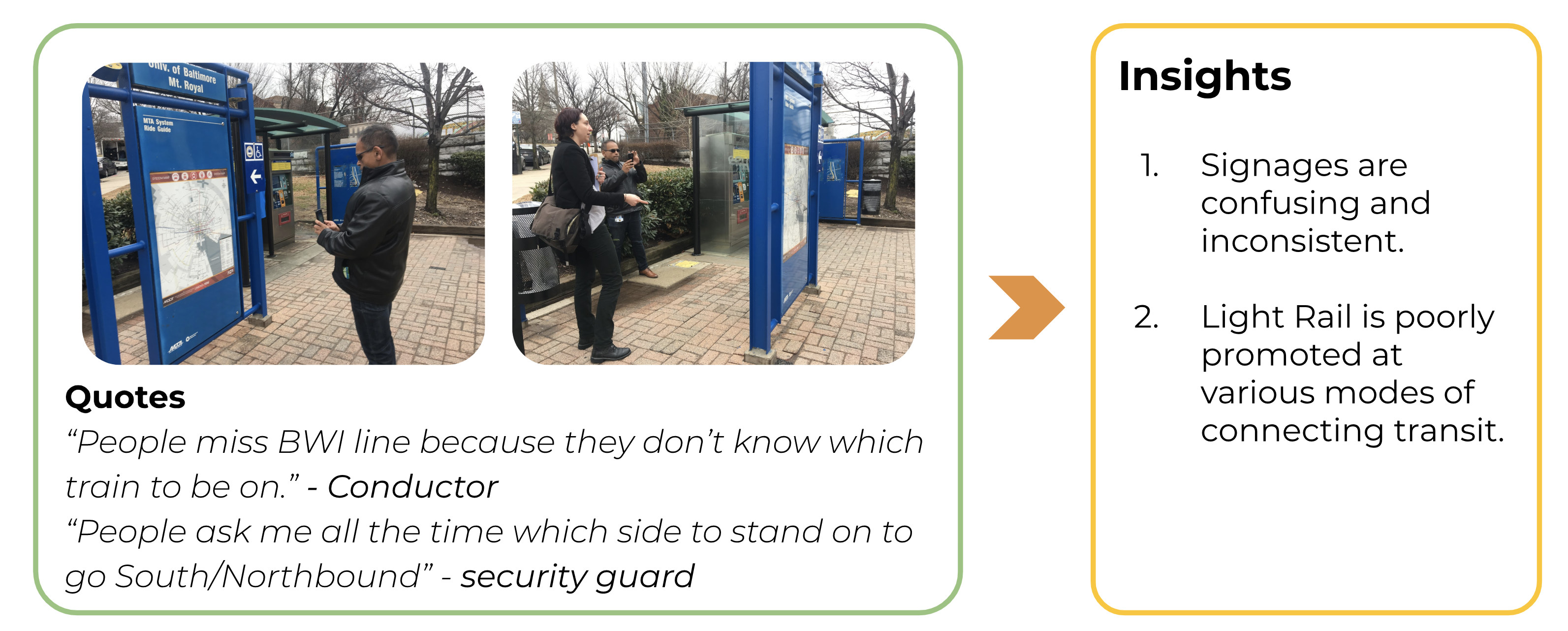 During our interviews and observations we discovered that wayfinding for the Light Rail was inconsistent and difficult. Listening to stories of passengers missing flights, taking the wrong trains because of directional inconsistencies in signage, and inability to locate stations indicated that there was an immediate need for wayfinding solutions.