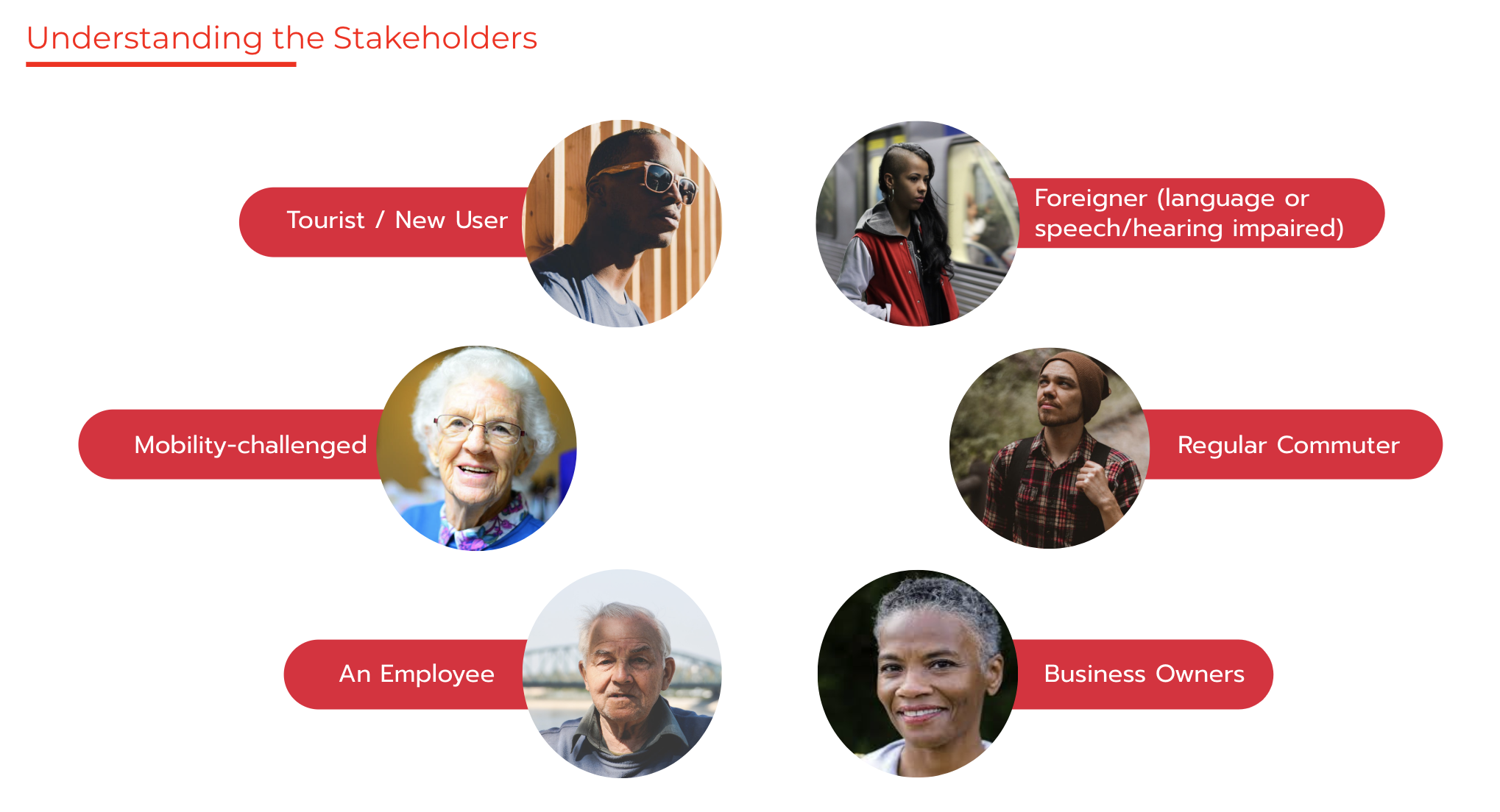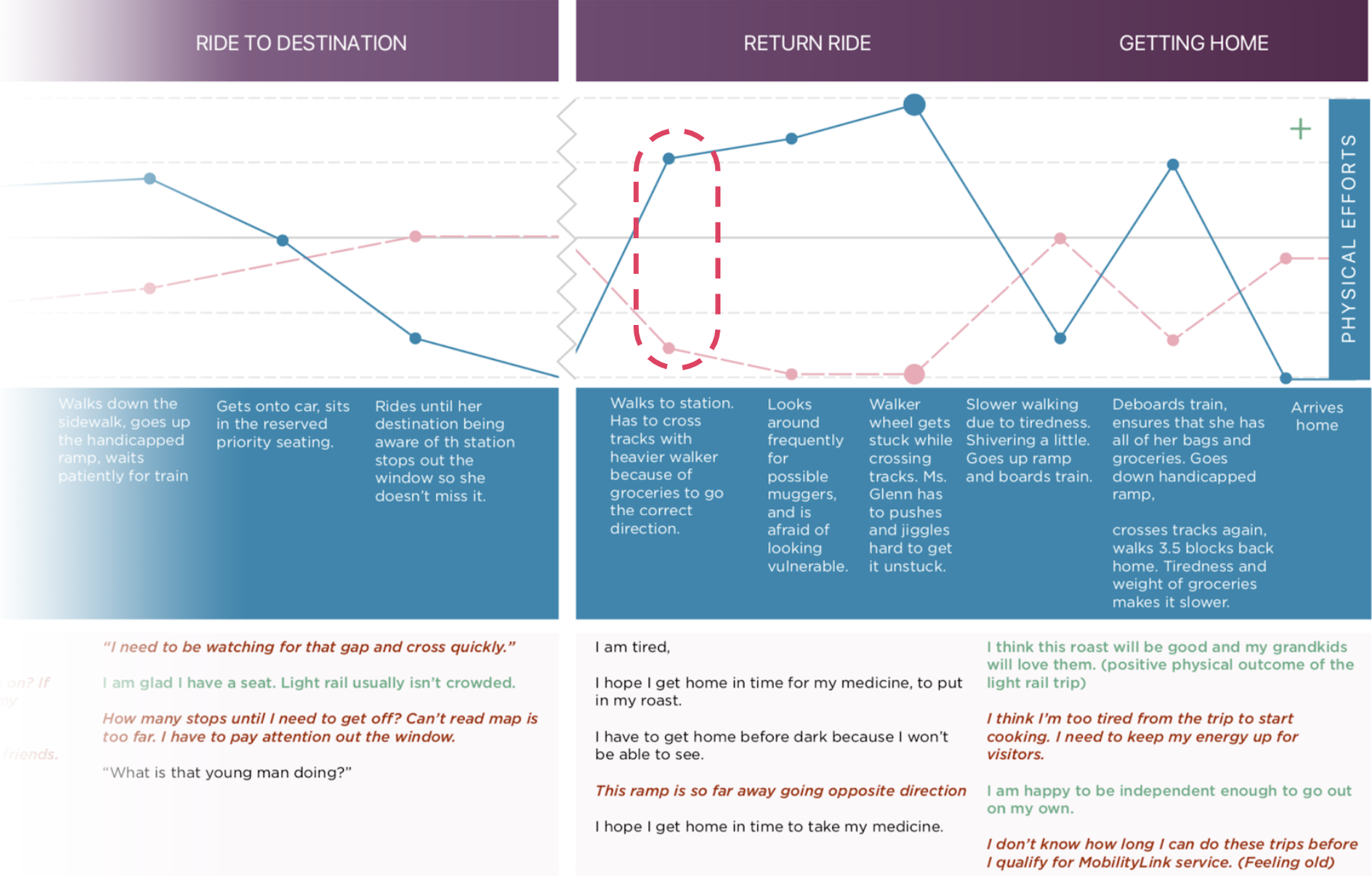 Developed six personas after a couple rounds of observation of light rail use and practice, as well as ethnographic interviews. These six personas encompass both the way-finding as well as the perception people carry when it relates to usage issues surrounding the light rail. From first time users, to mandatory (those who have no other means of transport) and habitual users, our personas helped us explore how interactions surrounding their lifestyles and their interaction with the light rail system had resulted in the formation of public and private perceptions that ultimately affected the MTA ecosystem.