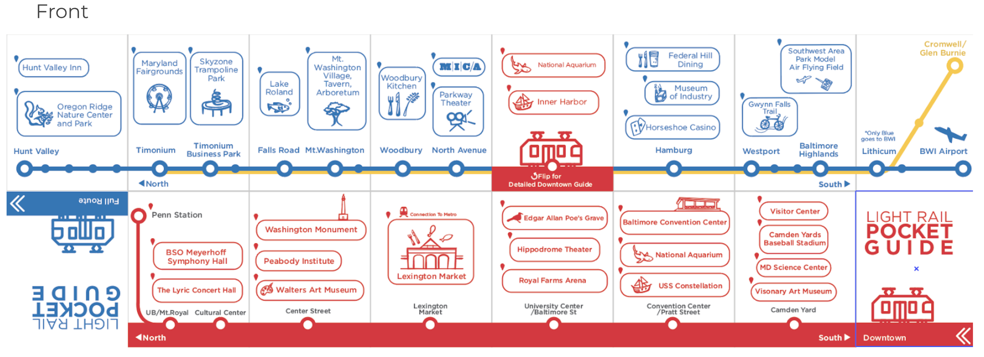 Light Rail reaches many destinations in Baltimore. Lack of support behind Light Rail from Tourism sector in the city including poor support from the hospitality sector where hotels provide poorly designed and not so user friendly brochures have resulted in the lack of any response from the tourists and visitors to the city. The most interesting observation was with the Convention center where there was no map related to the Light Rail which could be a great connectivity and transportation mode for all the events.