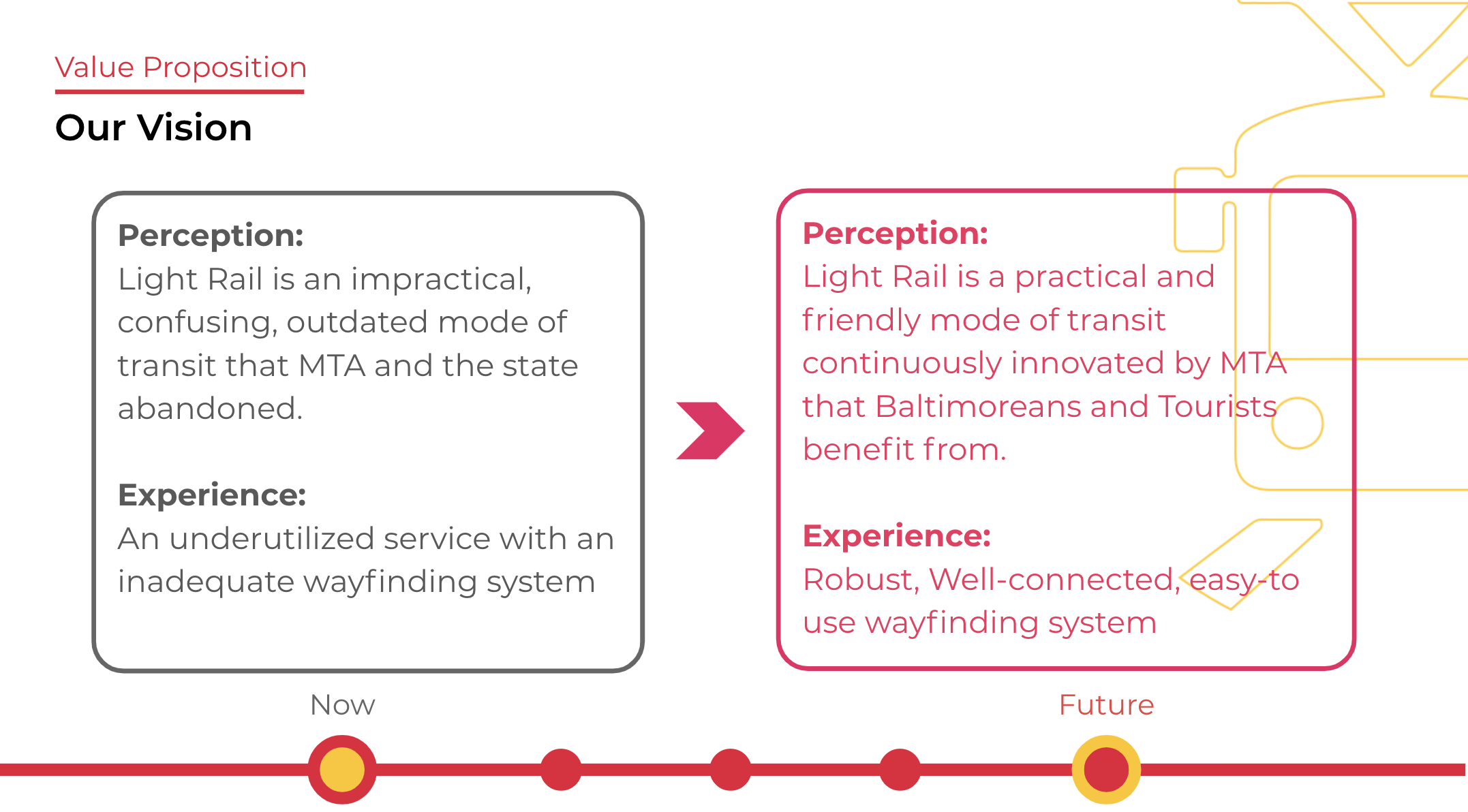 Meet original needs of the MTA while addressing deeper behavioral patterns and perceptions of current light rail users, potential users, and the citizens of Baltimore.